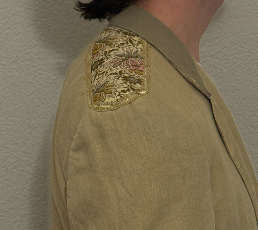 • Spalline Ricamate: L'elemento più distintivo sono le applicazioni sulle spalle. Presentano un ricamo floreale a telaio con motivi botanici , verde salvia e oro, che richiamano lo stile barocco o l'arredamento d'epoca.